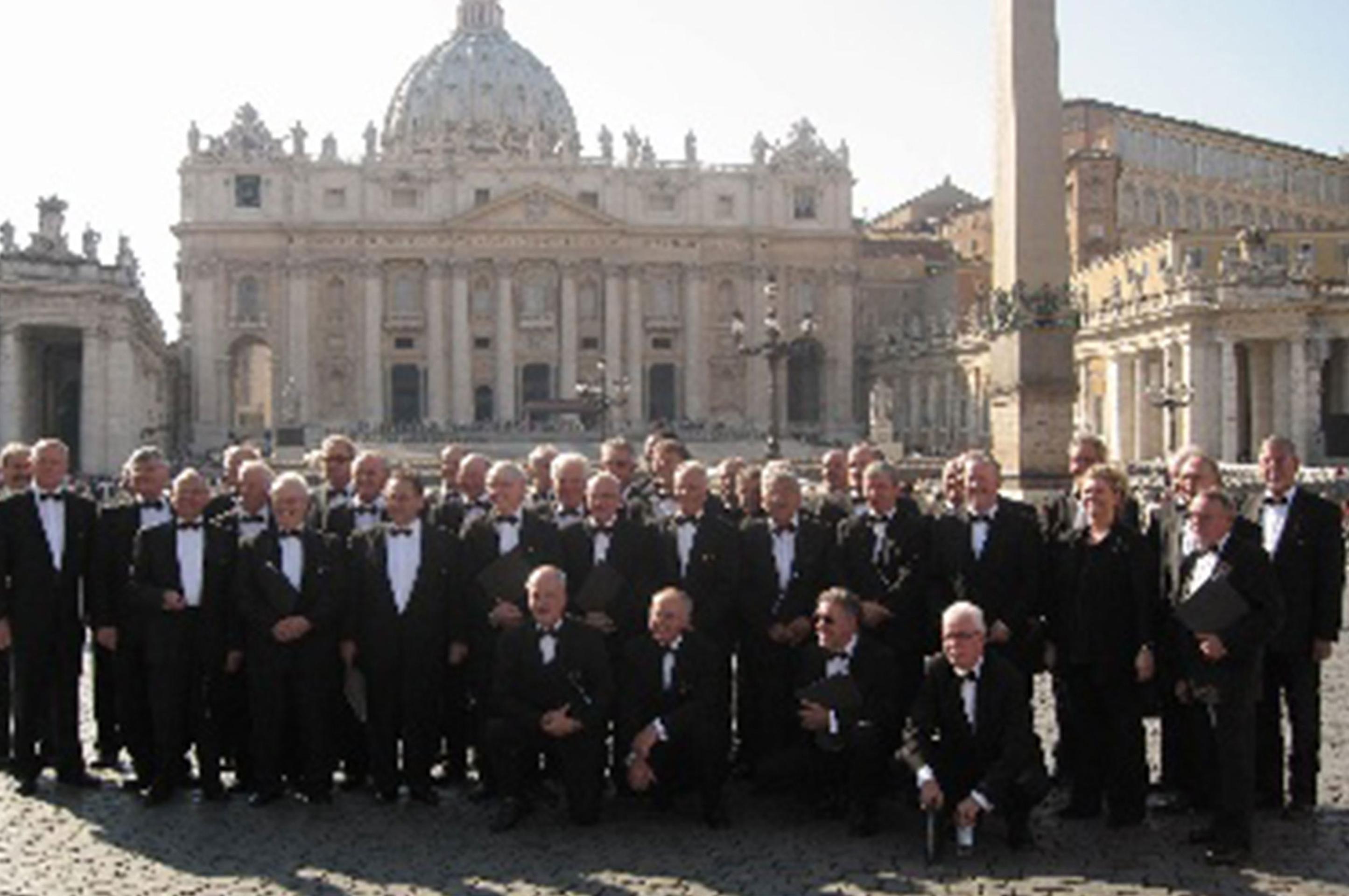 Diepe indruk maakt de Sixtijnse kapel. De kapel schittert sinds de restauratie in de jaren negentig van de vorige eeuw in vrolijke felle kleuren. Een zo goed als nieuwe Michelangelo kwam te voorschijn. Adembenemend is de St.Pieterskerk. De basiliek strekt zich uit over een oppervlak dat 2,5 keer zo groot is als dat van de Dom van Keulen, is 211 m lang, 186 m breed en 132 m hoog. Er kunnen 60.000 mensen in. De St. Pieter is in 120 jaar gebouwd. De eerste bouwmeester is Bramante. Het is nauwelijks voor te stellen dat straks in dit enorme bouwwerk met al zijn rijkdom het mannenkoor St. Caecilia uit Sweikhuizen de avondmis opluistert. Om 15.30 uur vertrekt het gezelschap weer naar het Vaticaan voor de H.Mis in de St. Pieter. Een leuke ervaring is te zien dat in de buurt van het Vaticaan aan diverse verkeersborden richtingaanwijzers hangen met alleen het opschrift “Mannenkoor Sweikhuizen”. De borden hangen er louter voor het koor en wijzen de bussen de weg naar de gereserveerde parkeerplaats. Om iedereen van het gezelschap de gelegenheid te geven het koor te fotograferen en te filmen zo direct voorafgaand aan hun historische optreden in de St. Pieter poseert het koor, prachtig uitgedost in kostuum, op het St.Pietersplein. Wat bedoeld is voor de eigen aanhang pakt anders uit. Binnen een mum van tijd staan rijen dik mensen afkomstig van “all over the world’’ eveneens het koor te fotografen en te filmen. Minuten lang is het een en al flitslicht.