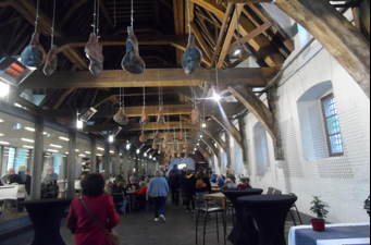 Wij hadden het weer niet mee. De meesten onder ons zochten een plek waar men gezellig kon verblijven en tevens iets nuttigen. Zo was er een oud slachthuis ingericht als restaurant. Het ‘Groot Vleeshuis’ zoals het hete. Daar was het goed toeven. Het was langwerpig gebouw uit 1400, een monument op zich. Binnen keek men naar boven tegen het gebint. Kunstzinnig hoe men die balken aan aan elkaar bouwden. Aan die balken hingen, door het hele gebouw, enkele honderden hammen te drogen die men kon kopen voor de prijs van 150 €.
