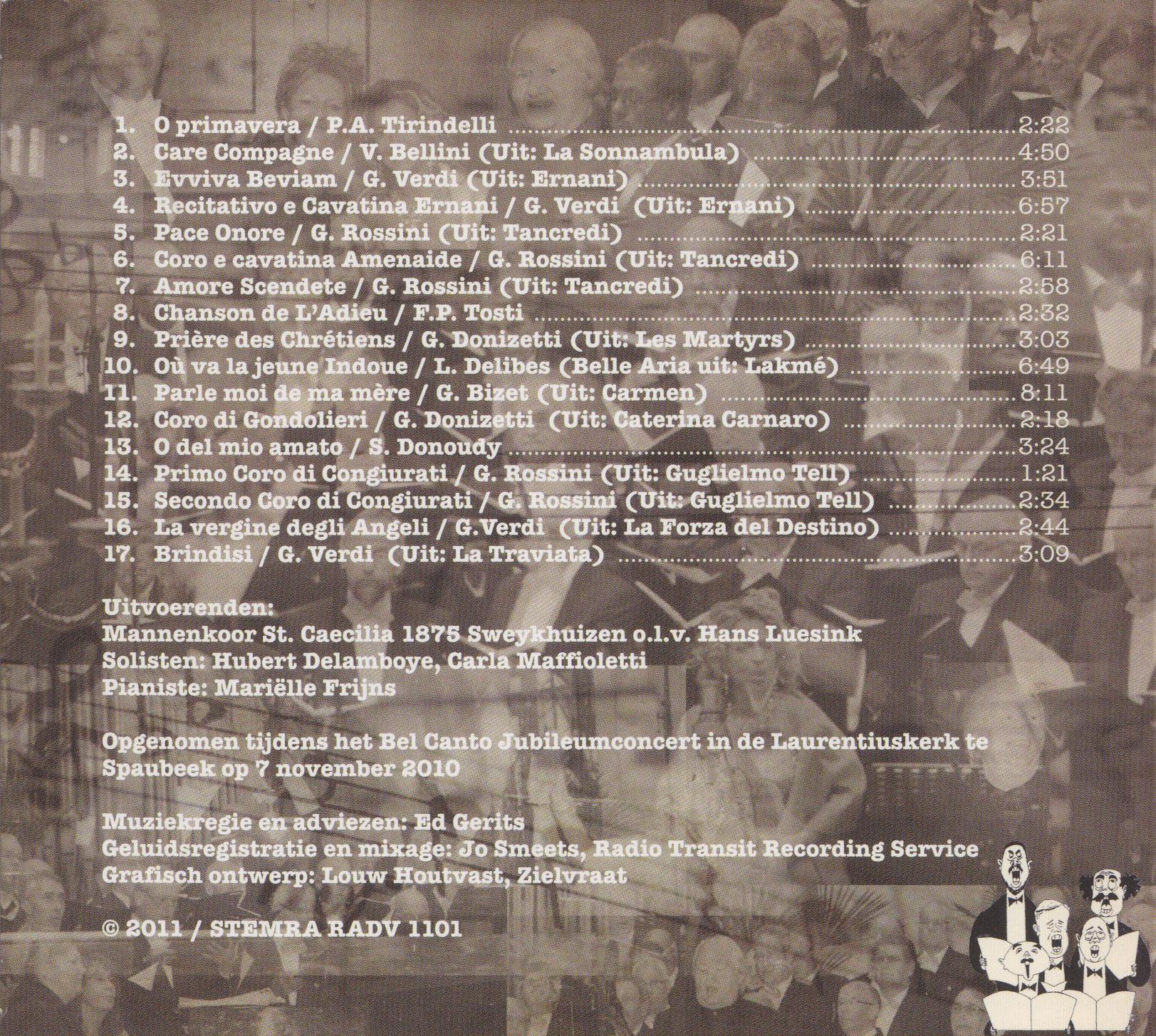 Van het hoogstaande en geheel uitverkochte Jubileumconcert dat gehouden werd op 7 november 2010, werden prachtige live opnames gemaakt. Van deze opnames heeft het koor een bijzonder geslaagde CD uitgebracht met de naam “Un incontro musicale”, hetgeen staat voor een muzikale ontmoeting tussen Mannenkoor St. Caecilia onder leiding van dirigent Hans Luesink met aan de vleugel Mariëlle Frijns en de jonge sopraan Carla Maffioletti en de alom bekende Limburgse tenor Hubert Delamboye. Op de CD staan werken van geliefde componisten als G. Donizetti, G. Verdi en G. Rossini. Aria´s als “O del mio amato” en “Olympia aria” worden op sublieme wijze vertolkt door de solisten. Het mannenkoor brengt o.a., al dan niet samen met de solisten, werken ten gehore als “Coro di Cavalieri” en “Priere des Chrétiens” met als afsluiting het bekende “Libiamo” uit ” La Traviata”.