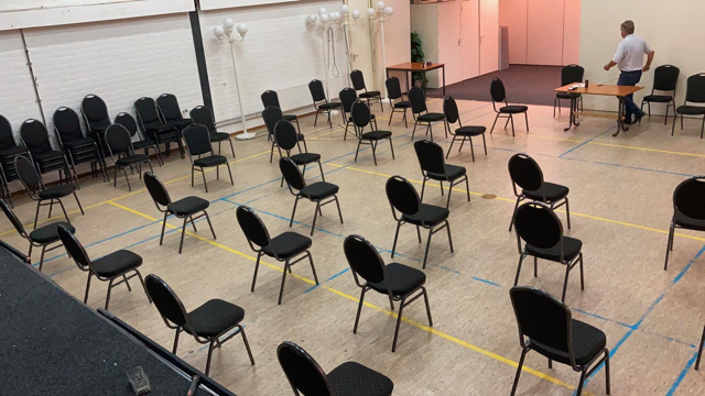 Tijdens de speciale ledenvergadering op 20 augustus j.l. met een opkomst van 35 personen is geconcludeerd dat vrijwel iedereen wilde starten met partijrepetities mits de veiligheid binnen het gebouw Rector Raevenhuis gewaarborgd is. Onderzoek en metingen aan het ventilatiesysteem hebben laten zien dat zingen verantwoord is met in achtname van heersende RIVM richtlijnen (onderstaande foto toont de opstelling van de stoelen voor de zangers op 1,5m afstand).